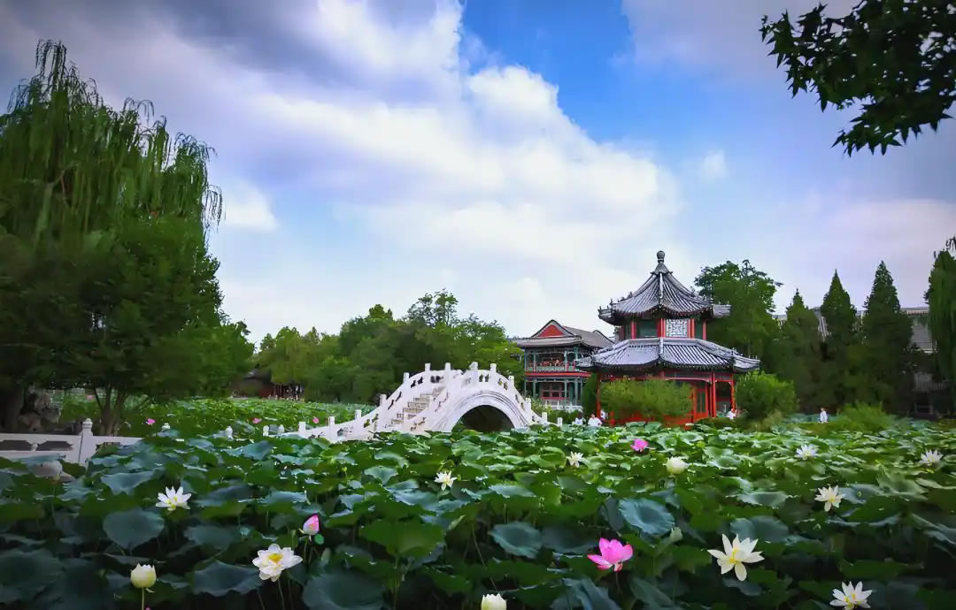 - 荷花景觀:夏季7-8月滿池荷花盛放,設(shè)3萬余㎡觀荷區(qū),展出“霓裳”“鄴城毓秀”等320余種荷花及60余種睡蓮;冬季冰瀑景觀壯觀。