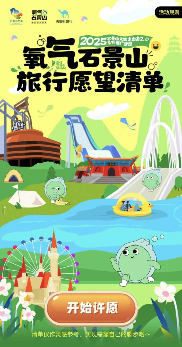 在“去哪兒”旅行APP上線“氧氣石景山”文旅專題頁,不僅整合酒店榜單、景區(qū)門票、優(yōu)質(zhì)攻略等核心文旅資源,更特別設(shè)置石景山區(qū)對(duì)口支援和協(xié)作地文旅產(chǎn)品版塊,實(shí)現(xiàn)“石景山推廣+支援地區(qū)助銷”雙重價(jià)值。同步推出的“旅行打卡愿望清單”H5,線上用戶可點(diǎn)亮自己的石景山旅游心愿,生成專屬旅行愿望清單;在高校路演活動(dòng)中,大學(xué)生可分享H5到社交媒體作為參與活動(dòng)的入場券——既為高校活動(dòng)預(yù)熱,更成為高校路演入場憑證,串聯(lián)起“線上互動(dòng)-線下參與”的閉環(huán)。