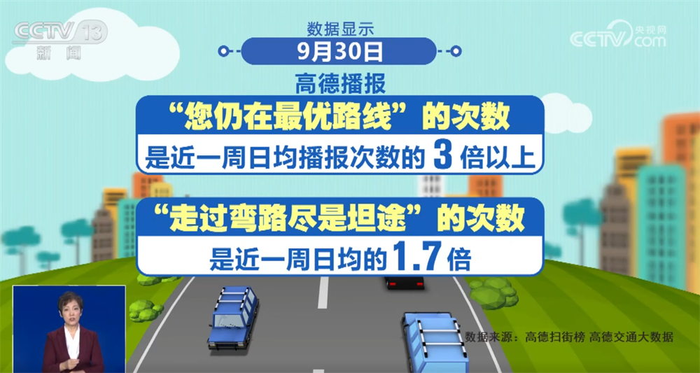我們?cè)賮?lái)看一個(gè)有趣的數(shù)據(jù)。“雖然前方擁堵,但您仍在最優(yōu)路線上”“今天走過(guò)了所有彎路,從此人生盡是坦途”,高德導(dǎo)航的“勸堵”金句與長(zhǎng)假出行實(shí)時(shí)相伴。數(shù)據(jù)顯示,9月30日,高德播報(bào)“您仍在最優(yōu)路線”的次數(shù)是近一周日均播報(bào)次數(shù)的3倍以上,播報(bào)“走過(guò)彎路盡是坦途”的次數(shù)是近一周日均的1.7倍,可見(jiàn)自駕出行的人越來(lái)越多。不過(guò),也有重慶網(wǎng)友表示“扎心”,“走過(guò)彎路還是彎路,坦途這句等我開(kāi)出重慶再說(shuō)。”