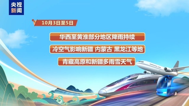 據(jù)中央氣象臺(tái)發(fā)布的消息,10月3日至5日,華西至黃淮一帶部分地區(qū)降雨持續(xù),冷空氣影響我國(guó)新疆、內(nèi)蒙古、黑龍江等地,青藏高原和新疆多雨雪天氣。公安部交通管理局提醒廣大駕駛?cè)撕统鲂腥罕姡⒁怅P(guān)注沿途及目的地氣象部門(mén)預(yù)報(bào)預(yù)警信息。