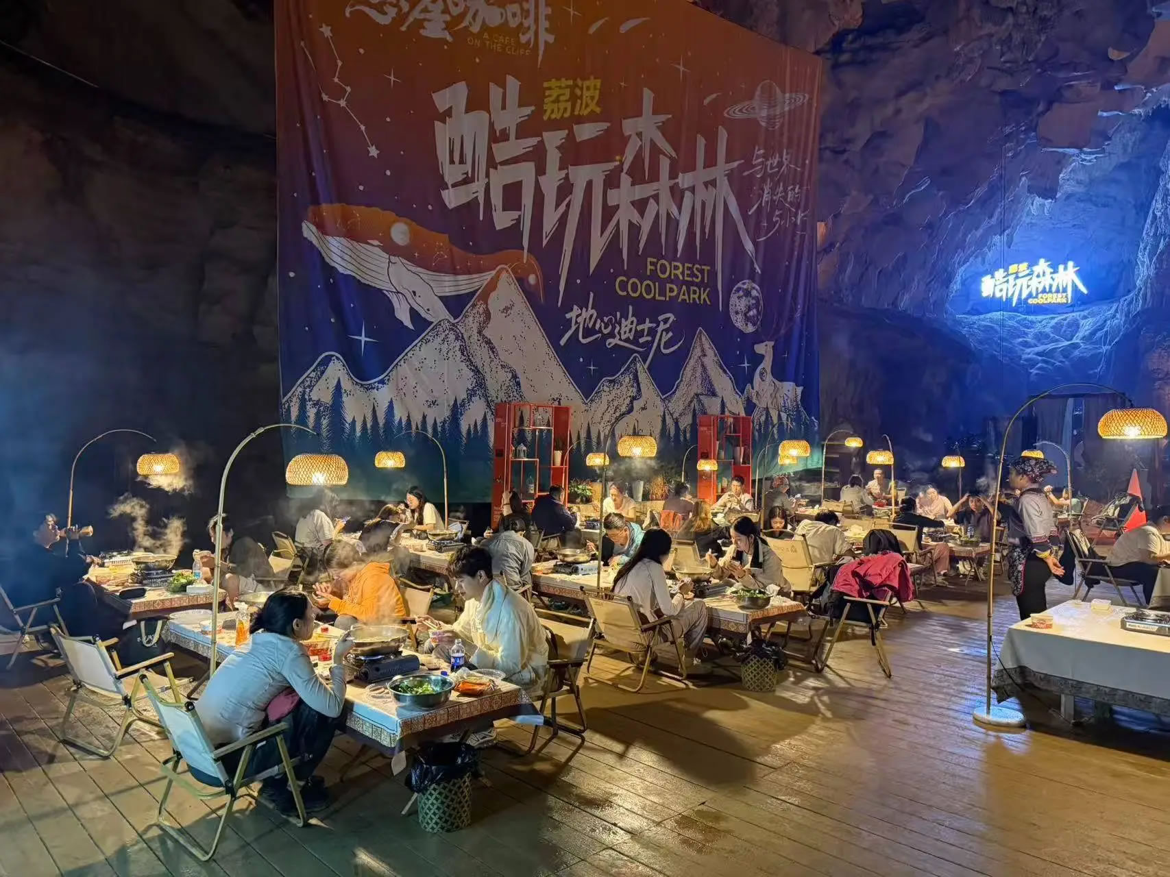 探險(xiǎn)之后,在常年保持15攝氏度的洞穴餐廳,吃上一頓熱氣騰騰的火鍋,感受與洞外溫差帶來的獨(dú)特體感,成為游客們的特別享受。開闊的洞廳內(nèi),數(shù)十張餐桌整齊排列,餐桌上方的暖色照明燈既保證了用餐所需的足夠亮度,又完整保留了洞穴的自然氛圍。游客們一邊圍坐火鍋旁大快朵頤,一邊欣賞巖壁上自然形成的奇異紋路,感受這個地下空間獨(dú)有的神秘。
