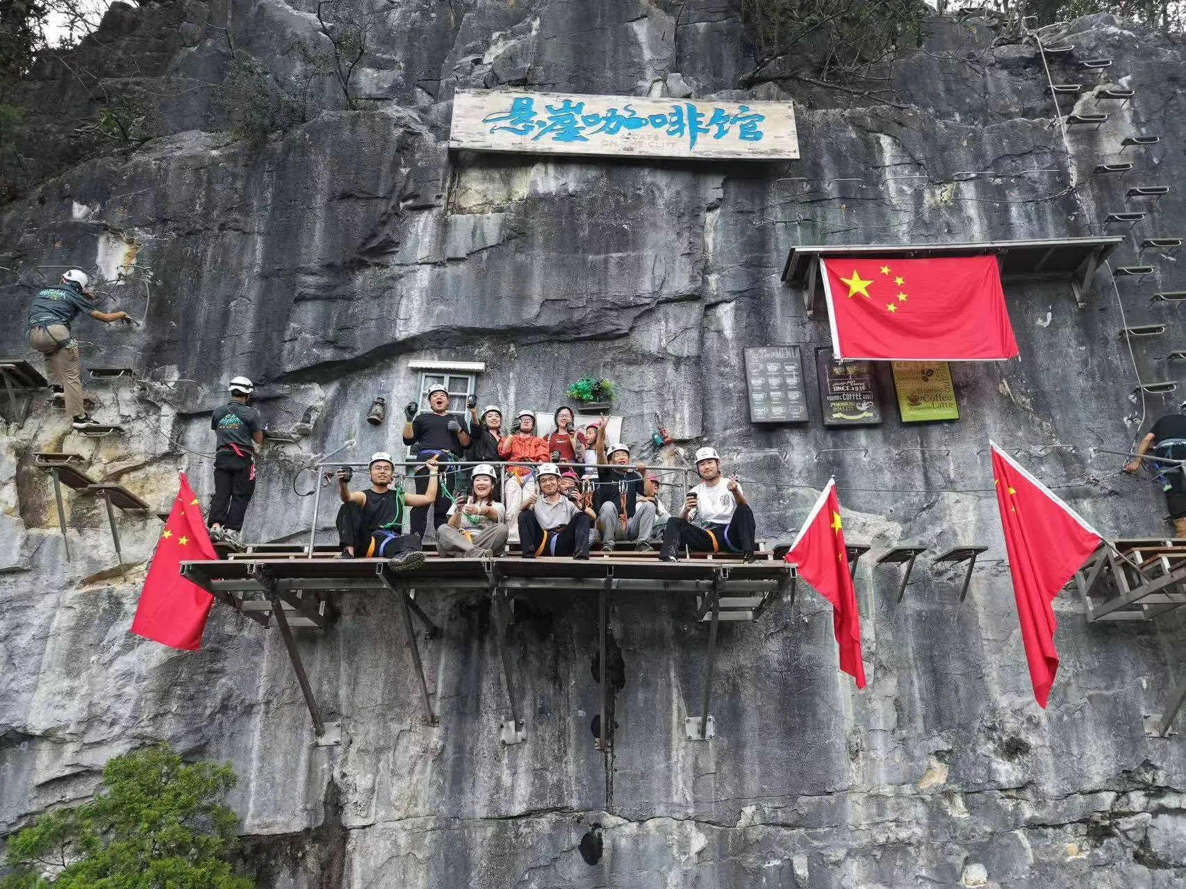 在距離地面200米的崖壁上喝上一杯咖啡,也是酷玩森林最受歡迎的項(xiàng)目之一。游客佩戴專業(yè)登山裝備,在教練陪同下沿固定路線攀登至懸崖中段的休息平臺。站在平臺上,山川云海盡收眼底,隨手拍都是 “朋友圈大片”,刺激又出片。