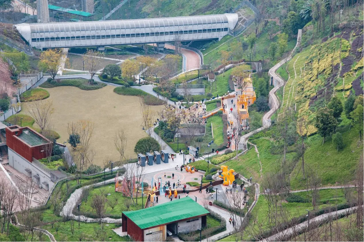 依山就勢,渝中區(qū)推進21萬平方米坡坎崖由“禿斑”變“綠毯”、由“荒地”變“游園”、由“治理點”變“打卡點”。實現(xiàn)了鵝嶺—虎頭巖10.8公里山脊線綠蔭如蓋,長江、嘉陵江11.5公里濱水綠帶織綠成廊。渝中在紅巖公園充分利用“漏斗”地形,擋墻加固崖壁緩坡,生態(tài)復(fù)綠4.35萬平方米,中間平坦區(qū)域開辟為兒童樂園,入選全國兒童友好空間典型案例。
