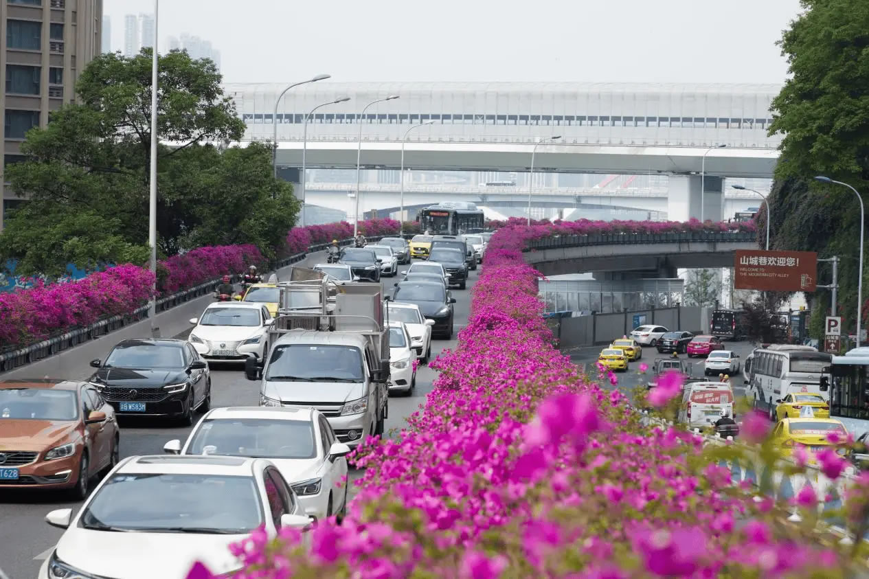 依托密集的立體交通網(wǎng)絡(luò),渝中區(qū)聚焦立交高架、人行天橋、軌道墩柱,打造四季有綠、全年可觀的路上風(fēng)景線,賦予城市交通色彩與活力。渝中區(qū)充分利用中興路高架橋兩側(cè)空間,通過鋼結(jié)構(gòu)支撐,加掛耐修剪、易養(yǎng)護的三角梅花箱,形成500米空中花廊。