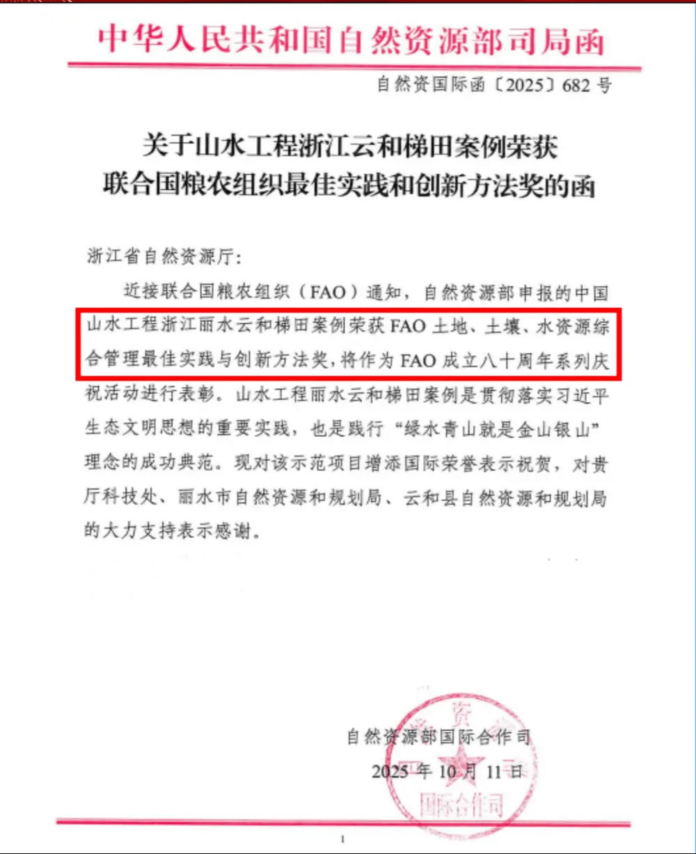 近日,中國山水工程浙江云和梯田項目榮獲聯合國糧農組織最佳實踐和創(chuàng)新方法獎,并將作為聯合國糧農組織(FAO)成立八十周年系列慶;顒舆M行表彰。