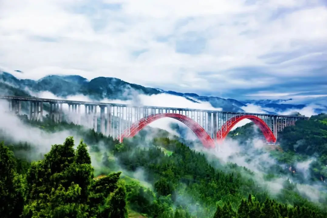山澗云興霞蔚,雙虹飛跨天險。橙紅拱如晨曦暈染,勾勒群山力量曲線;簡潔的四肢鋼管,書寫出結構美學的動人詩篇。索道飛越,是工程與自然的和諧共舞;樁基深植,是技術與地質的真誠對話。雙堡特大橋連接山與山,更連接人與自然。